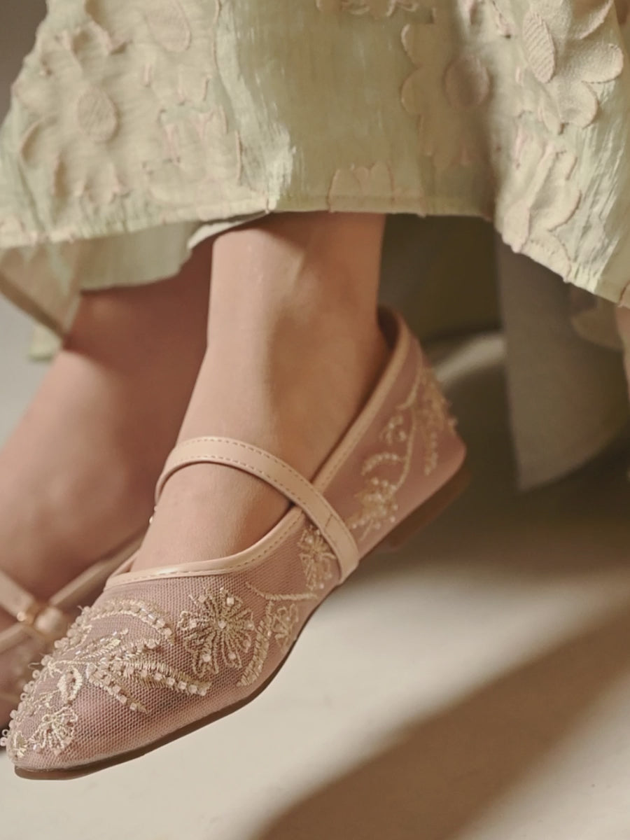 Where modern elegance meets delicate artistry, Estee Lace are a quiet celebration of beaded floral beauty. The transparent mesh upper is adorned with intricate beadwork each detail carefully arranged like flower in soft sunlight. Perfect for those who seek a balance of elegance and practicality.