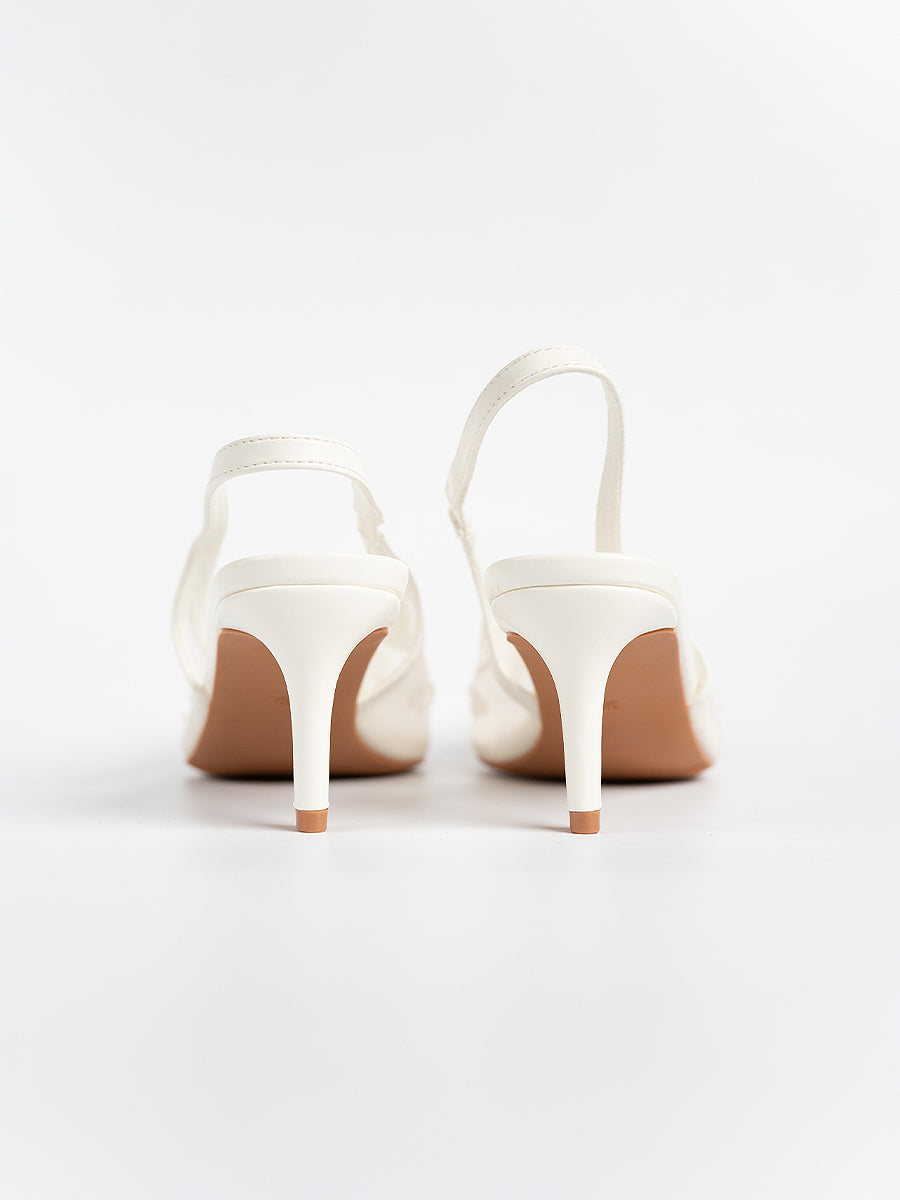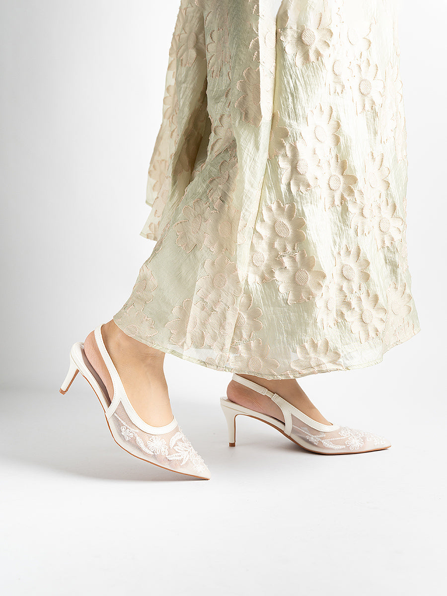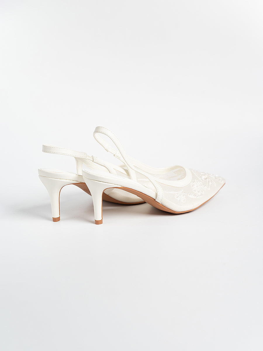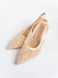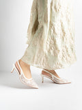 Evora Lace Slingbacks Pumps: For moments that call for a touch of elevation, with its mesh silhouette and slingback design, this pair seamlessly complements any ensemble. Whether it’s a graceful walk down the aisle, bridesmaid elegance, or a festive reception look, you’ll be amazed at how versatile these heels are—perfect for weddings and every celebration beyond.