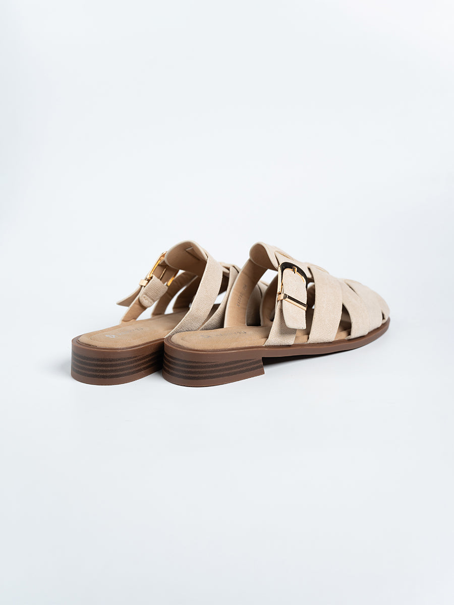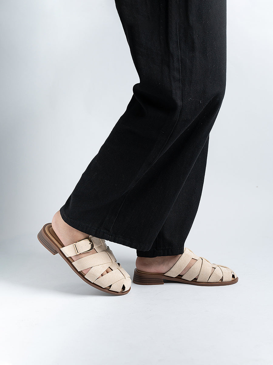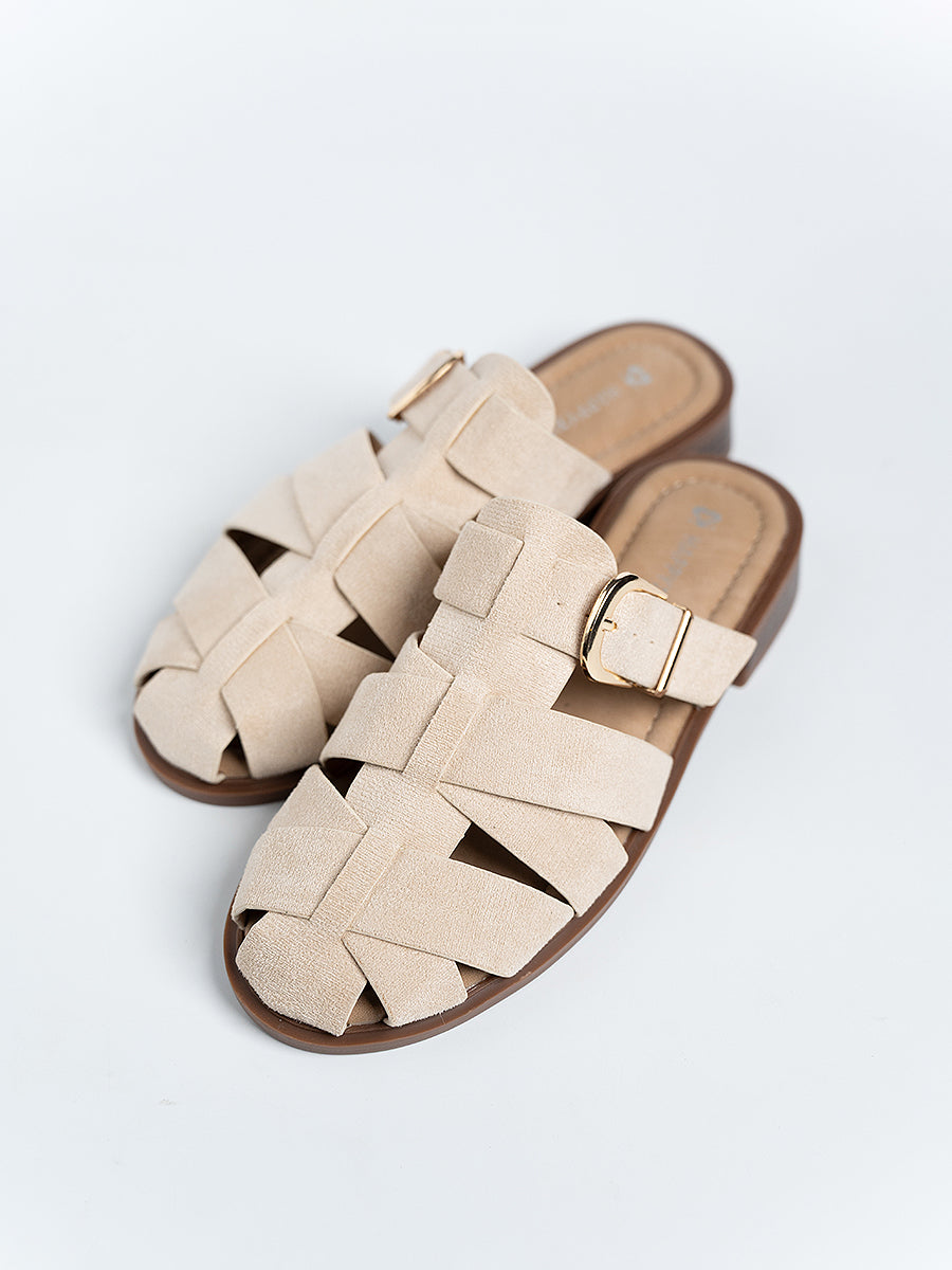 The Flynn Suede Cage Mules are inspired by classic gladiator styles, crafted from soft suede leather and accented with a polished shiny buckle for a refined touch. Set on 3cm low platform soles that offer the perfect lift, they blend timeless elegance with everyday comfort—effortlessly elevating your look from day to night.