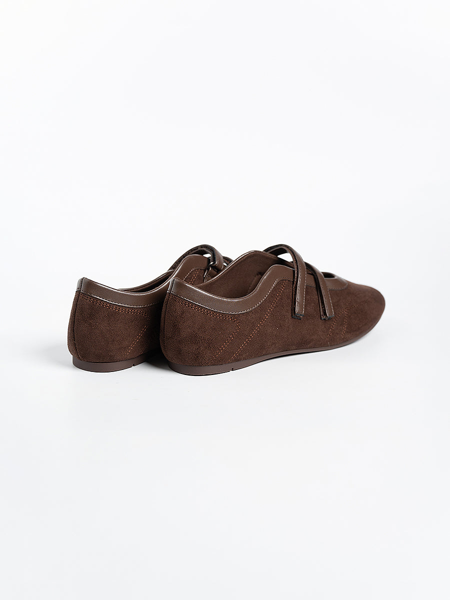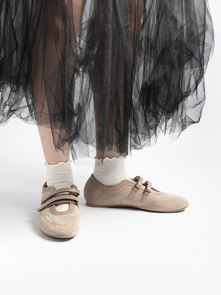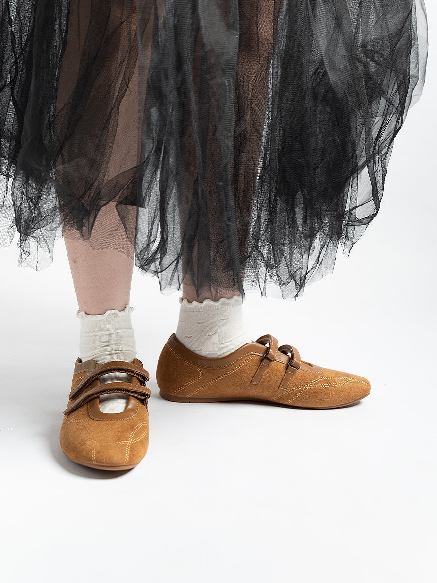 Voline Suede Flats: A suede reinterpretation of our signature Sport Ballerina, designed with a clean, minimal mood for everyday wear. Crafted from a refined blend of soft suede and smooth faux leather, this pair delivers a warm, polished aesthetic. Delicate stitching details highlight the classic round-toe silhouette, adding subtle character while maintaining effortless simplicity.